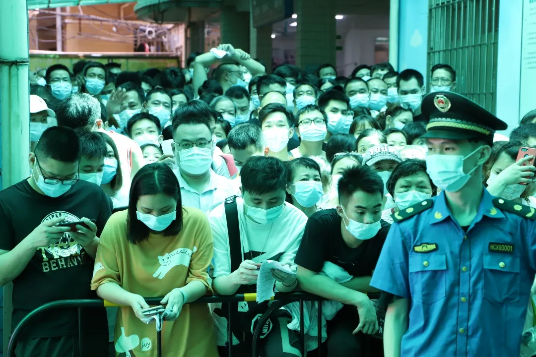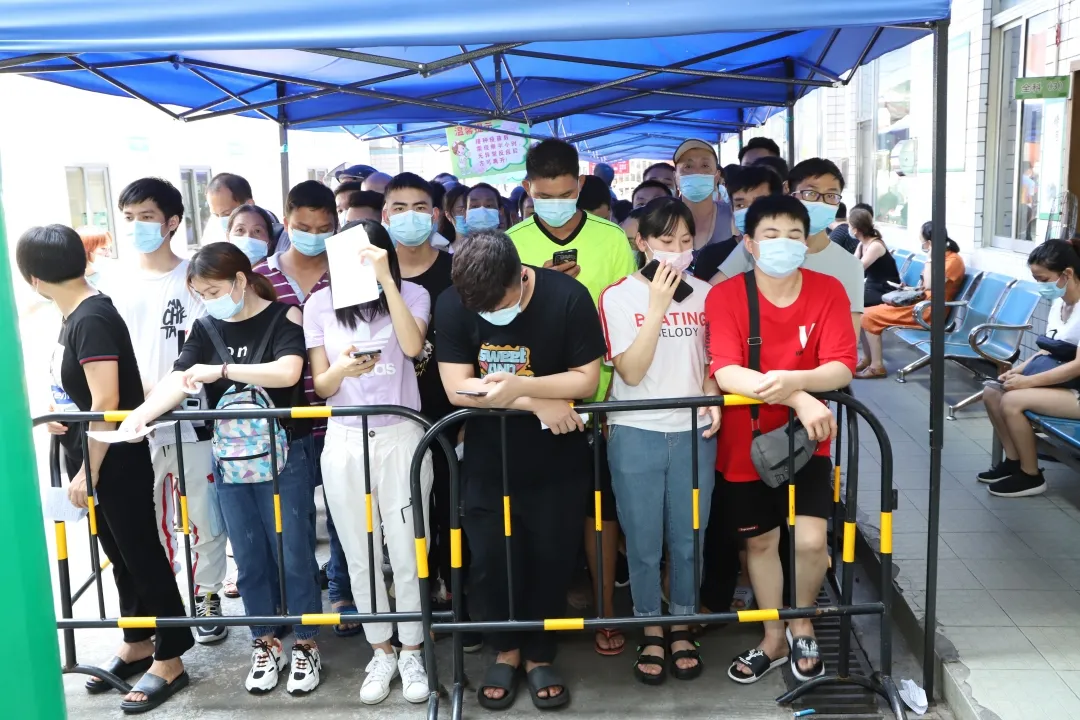 27日零晨一点,黄村医院门口已经有人开始在排队,很多居民已经做好“长线战斗”的准备,搬好了板凳,准备好了防晒伞,等待着医院打开大门所以,我们目睹了一个让人难以想象的场景:医院门口被堵得水泄不通,三四条数公里的队伍延绵到深巷中。这像极了春运时火车站那种人满为患、归家似箭的画面。珠吉中心、员村中心亦是如此,下午2点才开始接种疫苗,早上11点队伍长度已经达到2公里。